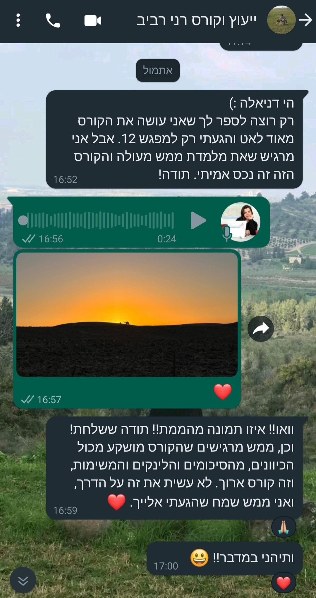 "אני רוצה קודם כל להגיד לך תודה רבה על קורס און ליין מרתק, מקצועי ונעים.